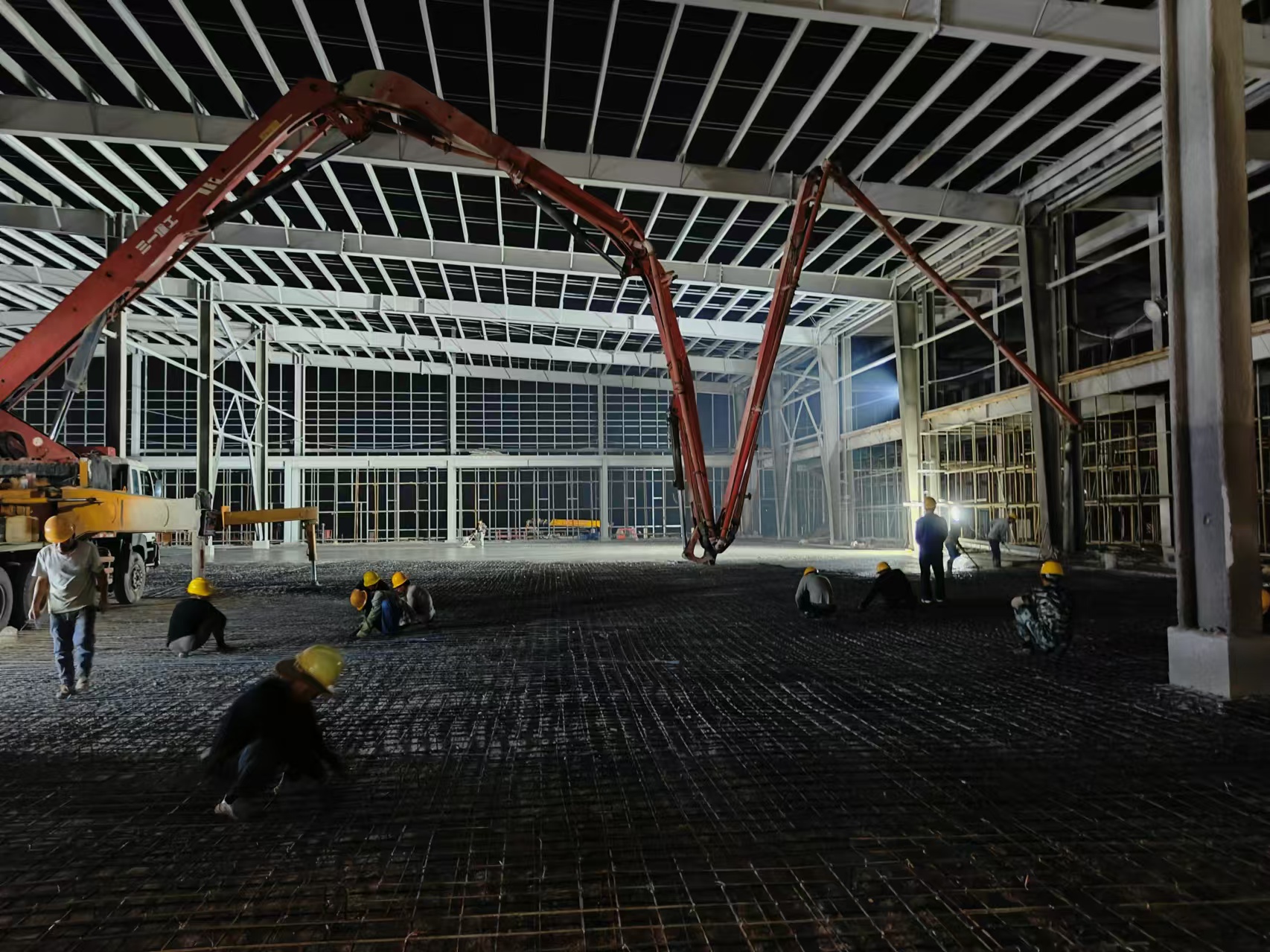 受征拆影響,工期更為緊張,深夜的項(xiàng)目部常常燈火通明,忙碌的身影隨處可見(jiàn),建設(shè)速度爭(zhēng)分奪秒,全力以赴搭建“物流心臟”。為確保工期不受影響,項(xiàng)目部實(shí)行“兩班倒”工作制,全體人員黑白班輪換,以實(shí)現(xiàn)工地日夜不停工,在現(xiàn)場(chǎng),工人們干得熱火朝天,各類運(yùn)輸車輛來(lái)回穿梭,泵車車臂相互交織,如同“蜘蛛俠”,不斷吞吐著混凝土,辦公室內(nèi),打印機(jī)不停工作,一道道身影連軸忙碌,激烈的討論聲不時(shí)從會(huì)議室傳出。