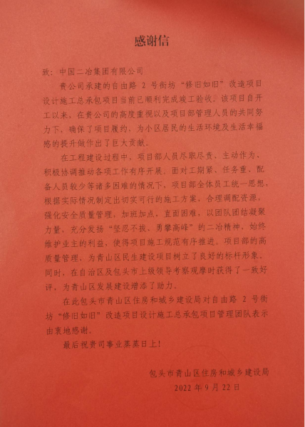 9月22日,中國二冶收到來自包頭市青山區(qū)住房和城鄉(xiāng)建設局的感謝信,對中國二冶在自由路 2 號街坊“修舊如舊”改造項目設計施工總承包項目中開展的工作給予高度贊揚。
