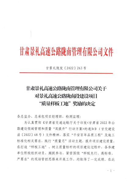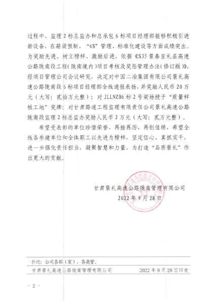 9月28日,甘肅景禮高速公路隴南管理有限公司發(fā)布通報(bào),對(duì)中國二冶甘肅分公司景禮項(xiàng)目部在“質(zhì)量樣板工地”評(píng)比中獲得優(yōu)異成績進(jìn)行通報(bào)表揚(yáng),景禮項(xiàng)目部二號(hào)梁場榮獲“質(zhì)量樣板工地”獎(jiǎng)牌,并給予20萬元嘉獎(jiǎng)。
