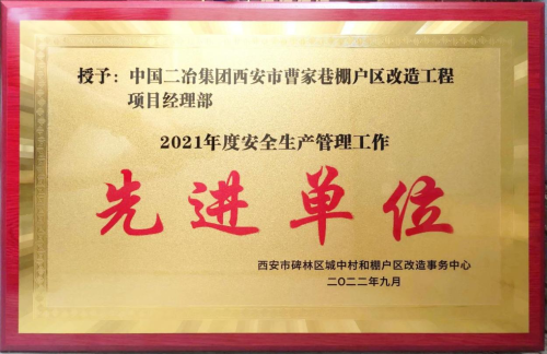 9月28日,中國二冶西安市曹家巷棚戶區(qū)改造工程收到由西安市碑林區(qū)城中村和棚戶區(qū)改造事務中心頒發(fā)的“2021年度安全生產(chǎn)管理工作先進單位”榮譽證書。